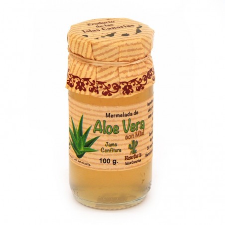 Aloe Vera jam. Ingredients: Aloe barbadensis, sugar, honey, fruit pectin, lemon juice. Prepared with 60 grams of aloe extract ppor 100 grams. Total sugar content: 40 grams per 100 grams. No preservatives or dyes. Presentation 100 g.