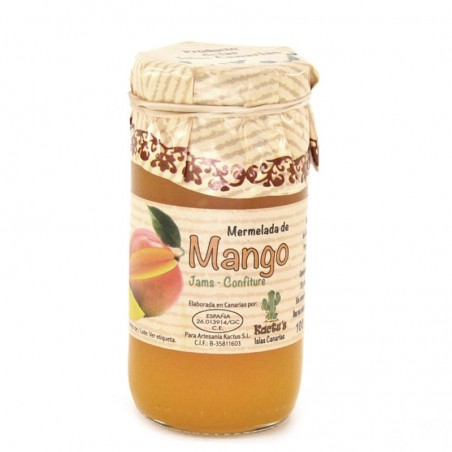 Mango jam. Ingredients: mango, sugar, fruit pectin, lemon juice, prepared with 70 grams of fruit per 100 grams. Total sugar content: 35 grams per 100 grams. No preservatives or dyes.