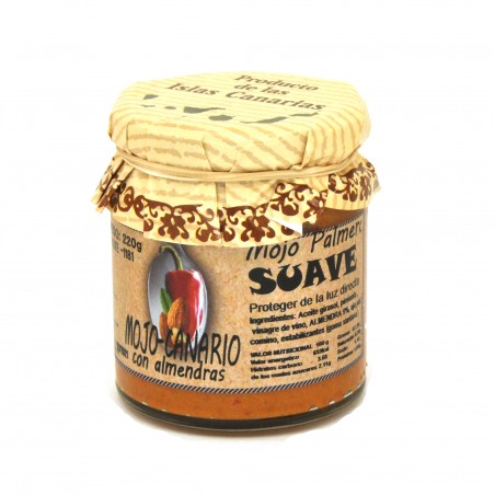 Mojo Palmero With almonds 220 gr. Ingredients: Sunflower oil, pepper, wine vinegar, almond 9%, garlic, salt, cumin, stabilizers. Handmade.