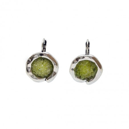 Pendientes fabricados en zamak y olivina por Enso Canarias. Material antialérgico.