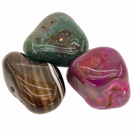 Ágata:suerte. Colores varios. Afinidad con los signos: Libra, Leo, Géminis,Cáncer, Virgo, Piscis y Escorpión. Fue venerada por los antiguos, y considerada la piedra de la suerte, el valor y la fuerza. Atrae la buena suerte en cuestiones relacionadas con el amor y la pasión. Número Asociado:1. Dimensiones: 2 x 3 cm.